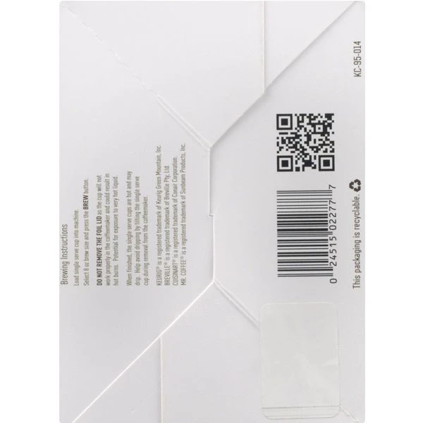 Brewing instructions: Load single serve cup into machine. Select 8 oz brew size and press the brew button. Do not remove the foil lid as the cup will not work properly in the coffeemaker and could result in hot burns. Potential for exposure to very hot liquid. When finished, the single serve cups are hot and may drip. Help avoid dripping by tilting the single serve cup during removal from the coffeemaker.