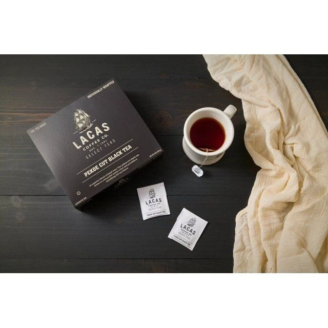 - Lacas Coffee Company Hot Tea Pekoe Cut Black Tea, available in a box of 100 individually wrapped tea bags.